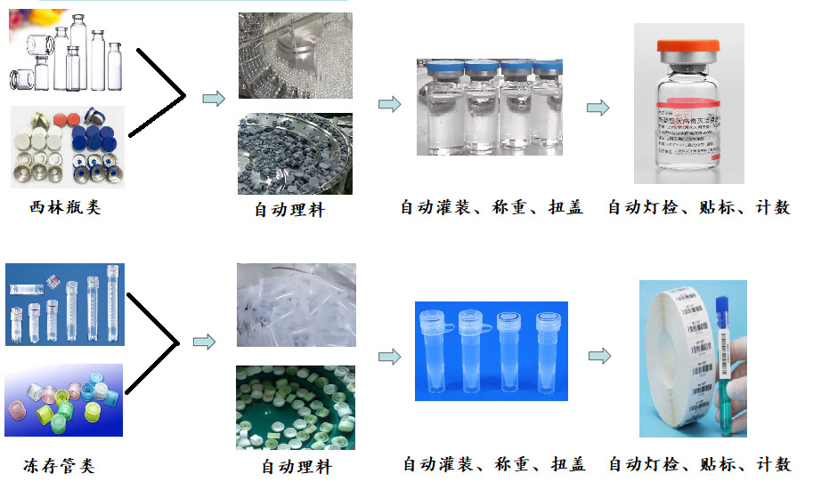 本產線可實現凍存管&西林瓶自動儲料—>自動理料供料—>CCD檢測瓶口—>自動空瓶稱重—>自動灌裝—>自動稱重—>自動供瓶蓋&膠塞—>瓶蓋良好性CCD檢測—>自動擰瓶蓋&加塞—>自動燈檢異物及空瓶—>CCD檢測擰蓋效果—>自動打標貼標—>貼標效果CCD檢測—>自動出料收集或碼盤(托盤緩存及出料)等一系列動作,使該類產品的生產灌裝貼標工序實現完全自動化,提升產能及品質,節省人工。
